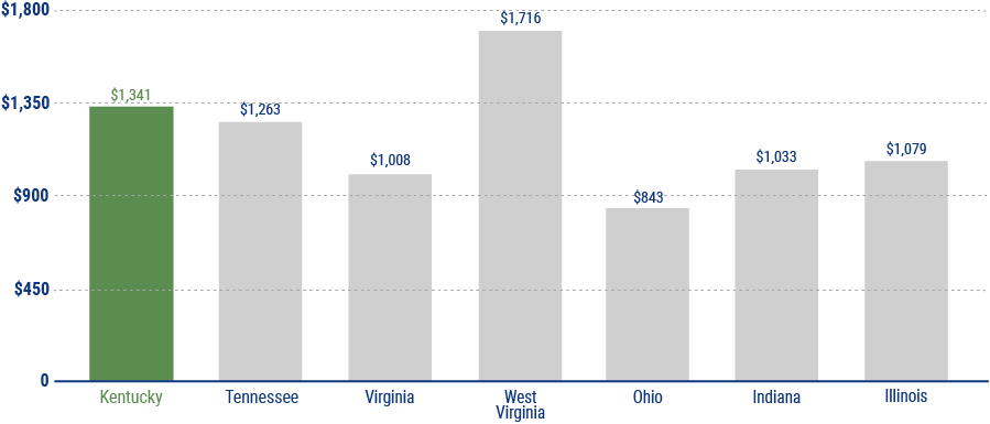 Vehicle owners in Kentucky pay an average of $1,341 per year for their coverage. This is just slightly higher than the national average rate of $1,311. Your price for coverage will be based on a number of factors, including specifics about your car (such as its make, model, and year), details about you (like your age, occupation, driving record, and credit score), and information about the other licensed drivers in your household. Every insurance company has its own way of calculating rates, so comparing quotes helps you be sure that you are getting your policy at a competitive price.