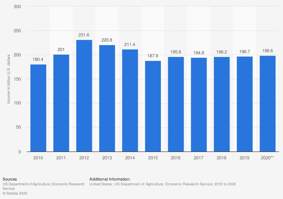 In 2020, cash receipts from farming came to around $198 billion dollars.